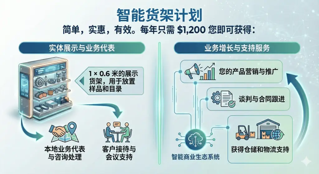 加入我们的智能货架计划,即可获得 1 米 × 0.6 米的货架 + 全方位商业推广服务,每年仅需 1200 美元。